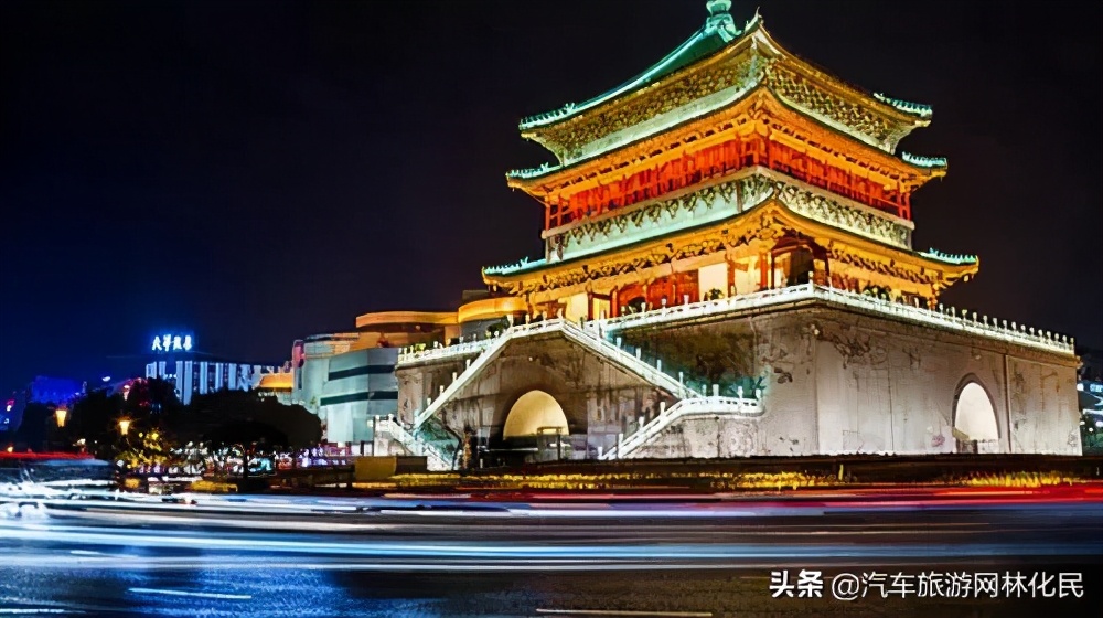 钟鼓楼广场:西安钟鼓楼是西安地标性建筑,位于西安市中心,是谓“晨钟暮鼓”,是古代重要的报时工具!每到夜晚,华灯照射,金碧辉煌