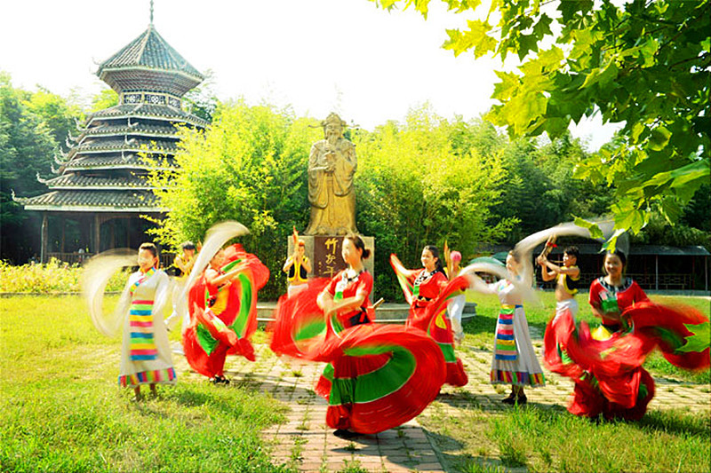 风景区充分体现了浓郁的江南风情和民族文化特色,园内建有侗族鼓楼、茶苑及民族文化村寨等30多处景观,配套了餐饮、住宿、旅游购物等服务设施。少数民族演出团常年为游客表演民族歌舞,特别设有游客参与性强的竹竿舞、等娱乐项目。